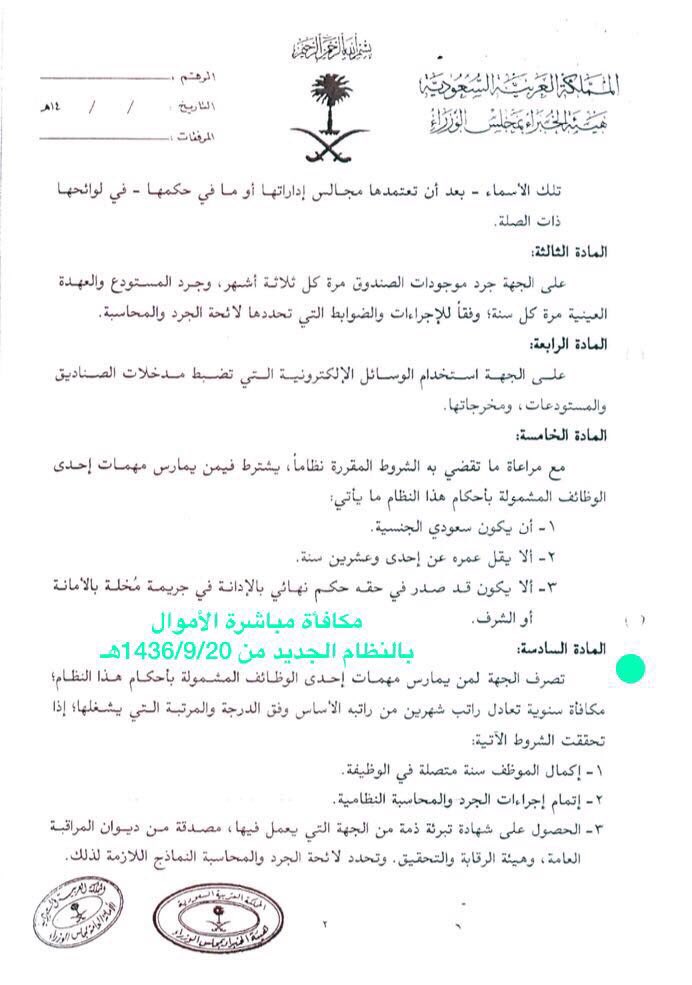 قــqararــرار Pa Twitter مكافأة مباشرة الأموال العامة تصرف عن الفترة من بداية تطبيق النظام الجديد في 1436 9 20هـ بشكل سنوي بواقع راتب شهرين أساسيين لكل سنة كاملة مكافأة الفترة ما قبل هذا التاريخ